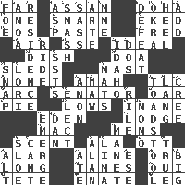 ACROSS 1. At a great distance 4. Indian state 9. Capital of the state of Qatar 13. Single 14. Excessive but superficial compliments 15. Made supply last 16. Greek goddess of the dawn 17. Thick mixture 18. Flintstone 19. Atmosphere 21. Compass dir. 22. Perfect 24. Food container 26. ___ good deed 27. Bobsleighs 29. Vertical spar for supporting sails 30. Music written for nine 31. Housemaid 33. Affectionate concern, for short 36. Curve 37. Legislator 40. Boat paddle 41. Sliced dessert 42. Coldest temperatures 43. Lacking in sense or substance 45. Paradise 47. Cabin 48. Big _ 49. Not women's 50. Aroma 52. Chicken ___ king 54. Baseball player Mel 56. Having or resembling wings 57. Place in a line 59. Globe 61. Protracted 62. Corrects by punishment or discipline 63. Fr. "Yes" 64. Wig 65. Related on the mother's side 66. Part of a journey DOWN 1. Enemy 2. Small Philippine buffalo 3. Dwelling 4. Viper 5. Box-office sellout 6. Backtalk 7. Johnson of "Laugh-In" 8. Madame (abbr.) 9. Outscore 10. Gumbo ingredient 11. Person who is morally reprehensible 12. Find the sum of 20. Travel on an animal 22. Potato state 23. Two (Sp.) 25. Fast planes 27. Fastener 28. Australian parrot (variant) 29. Floor coverings 31. At once, immediately (arch.) 32. Informal term for the mouth 33. Inedible or poisonous agaric 34. Austrian-born American filmmaker Fritz 35. Algonquian 38. Opt 39. Cause heat under the collar 44. Words to Nanette 45. Develop 46. Daniel's nick name 49. French painter Edouard 50. _ gin 51. Patter 52. Actor Alda or Thicke 53. Pale green bean 55. Loyal 56. Keyboard modifier key 57. Had dinner 58. Compass dir. 60. Of large size