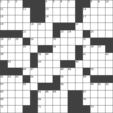 ACROSS 1. Actress Charlotte 4. South Vietnam president (1954) 8. Personal Computers (abbr.) 11. Baking chamber 13. Inactive volcano in Sicily 14. Jai _ 15. _ and Stitch 16. Kenny Rogers chart-topper in '80 17. Sure thing 18. Center 21. Calif. Air Force Base 22. Plunder 23. R.R. building 25. Distress signal 26. Storage container 29. Orators 32. Dodge 34. Sound made by sheep 35. Mouth or opening 38. Grandmother 39. Leaves out 41. Pale green bean 43. Not either 44. Groovy apt. 45. Debunk (Brit. slang) 46. Plea 50. A female animal or person 51. White ___ sheet 54. Compass dir. 55. Airtight sealed metal containers 57. To gather and bind into a bundle 59. Pertaining to the sea 63. "Two Mules for Sister ____" 64. Land elevation 67. Nathan's nickname 68. Operatic vocal solo 69. Taken by mouth 70. Connect, as a bridge 71. Binary compound 72. Bar bills 73. Keyboard modifier key DOWN 1. Hero or heavy, e.g. 2. Opinion 3. Snakelike fish 4. Erase 5. Call ___ day 6. Conclusion 7. Can I? 8. Entreaties 9. Monte _, Las Vegas Hotel/Casino 10. Settings 12. Christmas carol 14. Adept person 19. Characteristic smell of wine 20. Police officer (slang) 21. Drinking establishment 23. Three-handed card game 24. Afternoon social gatherings 26. Benjamin's nick name 27. _ the terrible 28. Billionth: prefix 30. Tolerate 31. Flatfish 33. Have the gumption 36. Teases 37. Nanny 39. Elects 40. Female horse 42. Mature 45. Unit of force 47. Science/research agcy. 48. Ringlike coral islands and reefs 49. Nervous spasm 51. Slender Brazilian palm 52. Pottery fragment 53. Nest on high 56. Without 58. American Automobile Association (abbr.) 60. California wine valley 61. Slanted text style (abbr.) 62. Penny 64. Being at a high temperature 65. Retirement account (abbr.) 66. Experiment locale