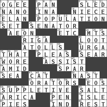 ACROSS 1. Double curve, resembling the letter S 5. Baking dish 8. Downhill vehicle 12. Billionth: prefix 13. _ tizzy (2 wds.) 14. Sibling's daughter 15. Flair 16. Census information 19. Put into a specified state 20. Legislator 21. Period of immesurable duration 23. And so on (abbr.) 24. Mountains (abbr.) 27. Port city in Latvia 30. Spoils 31. Ringlike coral islands and reefs 34. Capital and largest city of Mongolia 35. Not this but _ 38. Entreaties 40. Burn superficially 41. Had on 42. Help 44. Among 45. Coast Guard woman 46. Ocean 47. Domesticated feline 50. Political cartoonist Thomas 53. Speakers 57. Greek goddess of the dawn 59. Supplying deficiencies 63. Table seasoning 64. N. Chile seaport 65. Animal enclosure 66. Capri or Wight 67. Sliced desserts 68. Indiana (abbr.) 69. Remainder DOWN 1. Washington bills 2. An organ shaped like a helmet 3. Maternal 4. Period of immesurable duration 5. Corncob 6. At once, immediately (arch.) 7. California wine valley 8. Be seated 9. Luau accessory 10. Environmental prefix 11. Lair 14. Drug cop 17. Shoshoni 18. Car dealer's back yard 20. In a ____ (agitated or irritated) 22. Spoke pompously 24. Greater amount 25. Ancient Roman robe 26. Play the lead 28. Grand Old Party 29. Silent film actress Nazimova 30. A period of five years 32. French article 33. Backtalk 35. It was, poetically 36. Dwelling 37. Operatic vocal solo 39. Small drink 43. Without 47. Root beer relative 48. "We ___ not amused" (Victoria) 49. Make lace 51. Gospel singer Marvin 52. For Whom the Bell _____ 54. Native american tent (variation) 55. Baking chamber 56. Tear apart 58. Proofreading order 59. Plant excrement 60. RI univ. 61. Sliced dessert 62. Personal Computers (abbr.) 63. Title for a knight