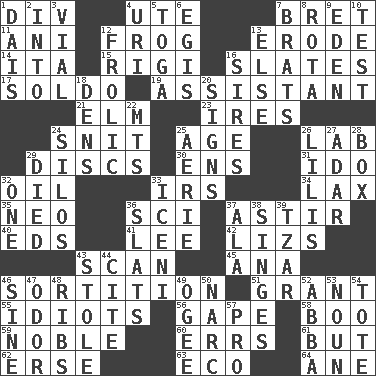 ACROSS 1. HTML Container Element 4. Shoshoni 7. Cy Young winner Saberhagen 11. Cuckoo 12. Toadlike animal 13. Eat (away) 14. Call ___ day 15. Swiss mountan, "Queen of the Mountains" 16. Chalkboards 17. Twentieth part of a lira 19. Helper 21. Shade tree 23. Angers 24. In a ____ (agitated or irritated) 25. Personal question 26. Experiment locale 29. Plates 30. Followers of ems 31. Wedding promise 32. Lubricate 33. Big collection agency 34. Not strict 35. Modern: prefix 36. _-fi 37. Being in motion 40. Begley and Asner 41. Area sheltered from the wind 42. Belonging to Elizabeth 43. Glance over 45. Santa ___, CA 46. Drawing lots 51. Monetary aid 55. Foolish or stupid persons 56. Open wide 58. Sometimes accompanies a hiss 59. Having high moral qualities 60. Blunders 61. With the exception that 62. Celtic language 63. Environmental prefix 64. One (Scot) DOWN 1. Raised platform 2. To the inside or interior of 3. Small bottle 4. RI univ. 5. Ancient Roman robe 6. Armor plate that protects the chest 7. Naughty children 8. Roll call or roster of names 9. Locale of original sin 10. Trial 12. Play 13. Otherwise 16. Titles for men of rank and authority 18. Lairs 20. Attaches a signature 22. Mountains (abbr.) 24. Grain storage towers 25. Nest on high 26. Ms. Damita and namesakes 27. The sixth month of the Jewish calendar 28. Gift holder 29. Passed on 32. Single 33. Ancient Celtic tribe of eastern Britain 36. Narrow boards 37. Insect wing 38. Scorches 39. Czar 43. Fur scarf 44. Quote 46. Trig term 47. Scent 48. Chest bones 49. Double curve, resembling the letter S 50. Drug cop 52. Swedish rock group 53. Part of speech 54. Carryall 57. Adept person