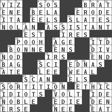 ACROSS 1. Namely 4. Mayday 7. Naughty child 11. Compass dir. 12. Actor Lugosi 13. Wear away 14. Call ___ day 15. Snakelike fish 16. Chalkboards 17. Pitcher Ryan 19. Aide 21. Eastern Standard Time (abbr.) 23. Angers 24. "Silly old bear" 25. Ripen 26. It would 29. Maid-servant 30. Followers of ems 31. HTML Container Element 32. Allow head to fall sleepily 33. Big collection agency 34. Conclusion 35. Paper or plastic container 36. _-fi 37. Ferber et al. 40. Had dinner 41. Area sheltered from the wind 42. Welt 43. Examine minutely or intensely 45. Raised railways 46. Conclusion 51. Moral principle 55. Foolish or stupid persons 56. Electrical Unit 58. Binary compound 59. Having high moral qualities 60. Singer Brickell 61. Lair 62. Celtic language 63. Born 64. Ingest DOWN 1. Distinctive style or manner 2. To the inside or interior of 3. Ardor 4. Perceive with the eye 5. Water jar 6. Backtalk 7. Naughty children 8. Round or rotation of duties 9. An important port of Yemen 10. Trial 12. Gillaume's butler role 13. Otherwise 16. Begets 18. Period of immesurable duration 20. Public displays of written messages 22. Definite Article 24. Porridge 25. Nest on high 26. Perfect 27. Canisters 28. Movie disc 29. Water vessel 32. Basketball assoc. 33. Ancient Celtic tribe of eastern Britain 36. Narrow boards 37. She-sheep 38. Erase 39. Political cartoonist Thomas 43. Took without asking 44. Quote 46. Trig term 47. Scent 48. Chest bones 49. Baking chamber 50. Connecting point 52. Flintstone garb 53. It may be bright or harebrained 54. Penny 57. Untruth