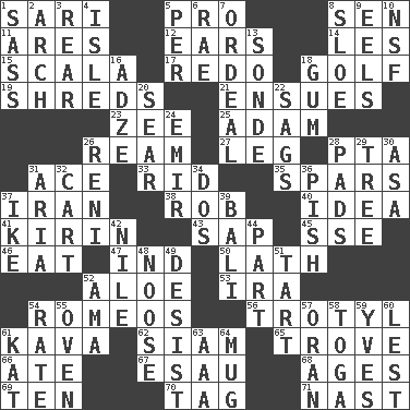 ACROSS 1. Indian skirt 5. Adept person 8. Elected rep. 11. Ancient Greek god of war 12. Hearing organs 14. French article 15. Any of the three canals of the cochlea 17. Redecorate 18. Eighteen holes 19. Fragments 21. Follows as a consequence or result 23. Last letter of the English alphabet 25. First of billions? 26. 480, 500 or 516 sheets of paper 27. Part of a journey 28. Parent Teacher Association (abbr.) 31. Adept person 33. To free from 35. Practice fights 37. SW Asia republic 38. Director Reiner 40. The main thing one is thinking about 41. Japanese brewing company 43. Plant excrement 45. Compass dir. 46. Erode 47. Working for oneself (abbr.) 50. Thin strip of wood or metal 52. _ vera 53. Retirement account (abbr.) 54. Lover boys 56. TNT 61. Polynesian shrub of the pepper family 62. Thailand, formerly 65. Collection of objects 66. Had dinner 67. Son of Isaac 68. Matures 69. Nine, plus one 70. Label 71. Political cartoonist Thomas DOWN 1. Backtalk 2. Bowlike part 3. Bring up, as a child 4. Capri or Wight 5. For each 6. Actress Charlotte 7. Severe or trying experience 8. A type of plum 9. Snakelike fish 10. Science/research agcy. 13. Message 16. Edge tool used to cut and shape wood 18. Chewing product 20. Scorch 22. Droops 24. Arab leader 26. Painter Guido (1575-1642) 28. Groovy apts. 29. Woody plant 30. White ___ sheet 31. Roberta Peters solo 32. Heavy open wagon 34. Two (Sp.) 36. Expression of disdain 37. Mamie's husband 39. Indonesian resort city 42. "Death on the ____" 44. Piece 48. Trap for birds or small mammals 49. Stop 51. Small pie 52. Nanny (var.) 54. Pace 55. Baking chamber 57. NW Algerian seaport 58. Ancient Roman robe 59. Jacques Cousteau's middle name 60. For fear that 61. Krazy ___ of comics 63. Auto club (abbr.) 64. Java container