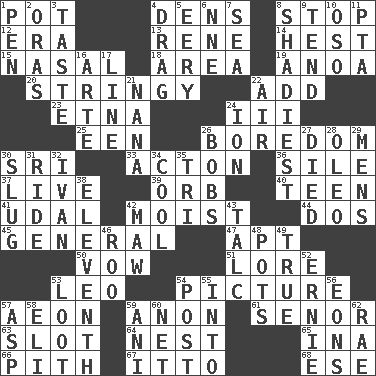 ACROSS 1. Cooking vessel 4. Hiding places for outlaws 8. Constrict 12. Epoch 13. French philosopher Descartes 14. Behest 15. Rhinal 18. Length times width 19. Small Philippine buffalo 20. Slender, wiry 22. Say or write further 23. Inactive volcano in Sicily 24. One more than two 25. Car or cant ending 26. Mood resulting from idleness 30. Indian title of respect (Mr.) 33. Gambison 36. Drop; flow; fall 37. Moving, as bait 39. Globe 40. Adolescent 41. Freehold land 42. Wet 44. Two (Sp.) 45. Commissioned military rank 47. Fitting 50. Promise 51. Old wives' tales, e.g. 53. Lion 54. Photo 57. Period of immesurable duration 59. At once, immediately (arch.) 61. Sir (Sp.) 63. Slit 64. A home for chicks 65. _ tizzy (2 wds.) 66. Heart or essence 67. "Tell ____ the Marines!" 68. Compass dir. DOWN 1. Fenced enclosure 2. Mouths or openings 3. Clothes sense 4. To trail on the ground 5. Suggestive of the supernatural 6. Compass dir. 7. Ocean 8. Most dark, concealed or hidden 9. Look after 10. Bear (Spanish) 11. Parent Teacher Association (abbr.) 16. Johnson of "Laugh-In" 17. Actor's bit 21. Grandmother 22. Atmosphere 24. Electrically charged atom 26. Moves up and down 27. Passed on 28. Margarine 29. Not women's 30. Snaillike creature with no shell 31. Travel on an animal 32. _ the terrible 34. Calm and collected 35. Three (prefix) 38. Veterans Day date 42. Informal term for the mouth 43. Baby powder 46. Friend of Pooh 48. Cooking vessels 49. Loyal 52. Bert's buddy 53. Plunder 54. Mail 55. To the inside or interior of 56. Immeasurably long periods of time 57. Cleo's killer 58. Biblical high priest 59. Cuckoo 60. Remaining after all deductions 62. Actress Charlotte