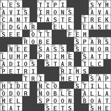ACROSS 1. French article 4. Native american tent (variation) 8. Symbol (abbr.) 11. Advice 13. Metal shackles 15. Actress Gardner 16. Patter 17. Clothes sense 18. Long journey 19. _ Allan Poe 21. Pipe bend 22. Relaxation 23. Perceive with the eye 24. Baseball player Mel 27. Opposite of masc. 29. Loose flowing garment 30. Practice fights 34. Born 36. Backtalk 39. Sir (Sp.) 40. Mass 41. First class 43. Suttee (variant) 44. Goodbye (Sp.) 46. Play the lead 47. Affectionate concern, for short 48. _ dish (used to culture cells) 49. Basketball hoops 51. Three (prefix) 53. Was introduced to 54. Plant excrement 57. Flintstone garb 60. Non-commissioned officer (abbr.) 63. Free from disturbance or agitation 65. Scent 66. Having high moral qualities 69. Silent film actress Nazimova 70. Cartoonist voice _ Blanc 71. Soup utensil 72. Water vessel 73. Erode 74. Puts into a specified state 75. A female animal or person DOWN 1. Shoestrings 2. Elude 3. Scorch 4. Teat (slang) 5. Retirement account (abbr.) 6. Introduce or present, as a question 7. International (abbr.) 8. "Two Mules for Sister ____" 9. Jacques Cousteau's middle name 10. Create 12. R.R. building 14. Oneself 18. Storms 20. Friend of Pooh 25. Cook's measure (abbr.) 26. Pulls into pieces 28. Curvy letter 29. News announcer 31. Of or related to the anus 32. College mil. group 33. Indian title of respect (Mr.) 34. Naked 35. Give off 37. Be seated 38. Excessive but superficial compliments 40. Pet locale 42. 4th largest of the Great Lakes 45. Title for a knight 50. Mountains (abbr.) 52. Taverns 54. Grain storage towers 55. Assad's deity 56. Food holder 57. Dwelling 58. The main thing one is thinking about 59. Stupid person 61. 911 reaches them 62. Mitch Miller's instrument 64. Keyboard key 67. Car dealer's back yard 68. Followers of ems
