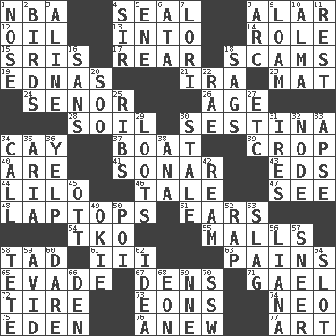 ACROSS 1. Basketball assoc. 4. Lick closed 8. Having or resembling wings 12. Lubricate 13. To the inside or interior of 14. Hero or heavy, e.g. 15. Indian titles of respect 17. Posterior 18. Fraudulent business schemes 19. Ferber et al. 21. Retirement account (abbr.) 23. Floor covering 24. Sir (Sp.) 26. Personal question 28. Land 30. French poetic form 34. Island 37. Water vessel 39. Riding implement 40. "We ___ not amused" (Victoria) 41. Underwater navigation system 43. Begley and Asner 44. _ and Stitch 46. Falsehood 47. Perceive with the eye 48. Portable computers 51. Hearing organs 54. Ring climax 55. Shopping centers 58. Small boy 61. One more than two 63. Aches 65. Elude 67. Lairs 71. Highlander 72. Become fatigued 73. Immeasurably long periods of time 74. Modern: prefix 75. Genesis locale 76. Afresh 77. Nonscientific branch of learning DOWN 1. Characteristic smell of wine 2. Avian creatures 3. Place in a line 4. Title for a knight 5. Compass dir. 6. _ moment's notice (2 wds.) 7. Australian parrot (variant) 8. Curve 9. Rich soil 10. _ mater 11. Relief 16. Without 18. Sinks 20. "Barney Miller" actor Jack 22. Actress Charlotte 25. Teases 27. And so on (abbr.) 29. Plunders 30. Lacking originality or spontaneity 31. Angers 32. Thickened enlargement 33. Domed church section 34. Give a ring to 35. Roberta Peters solo 36. Sharp bark 38. Santa ___, CA 42. 480, 500 or 516 sheets of paper 45. Baseball player Mel 49. Migrant worker of the '30s 50. Luau course 52. Hit sharply and swiftly 53. Volcanic refuse 56. Climbing, woody, usually tropical vines 57. Contemptuous expression 58. Wig 59. Enthusiastic 60. Have the gumption 62. The main thing one is thinking about 64. Slit 66. Lair 68. A really long time 69. Compass dir. 70. Compass dir.