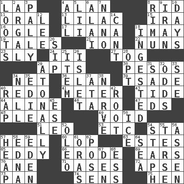ACROSS 1. Infant locale 4. Actor Alda or Thicke 8. To free from 11. Relating to the mouth 13. Pale purple color 15. Retirement account (abbr.) 16. Stare at amorously 17. Climbing, woody, usually tropical vines 18. "If ____ say so..." 19. Lies 21. Electrically charged atom 22. Religious women 23. Mischievous 24. One more than two 27. Coat; cloak 29. Flats, for short 30. Mexican monetary units 34. Remaining after all deductions 36. Flair 39. Sadhe (variant) 40. Do over again 41. Distance measurement 43. Event that recurs at intervals 44. Place in a line 46. Pacific island yam 47. Begley and Asner 48. Entreaties 49. Null 51. Lion 53. And so on (abbr.) 54. R.R. building 57. The bottom of a shoe or boot 60. Trim (branches) 63. _____ Park, CO 65. Whirlpool 66. Wear away 69. Hearing organs 70. A saturated hydrocarbon 71. Fertile tracts in a desert 72. Domed church section 73. Baking dish 74. Elected reps. 75. Layer DOWN 1. Plunders 2. Therefore, facetiously 3. Friendly 4. Everything 5. Cards in a Roman deck? 6. Jai ____ 7. Billionth: prefix 8. Tall New Zealand timber tree 9. SW Asia republic 10. 24-hour periods 12. Area sheltered from the wind 14. Patter 18. Swallowed 20. Small drink 25. Detail 26. Small island 28. Elect 29. Lacking a tonal center or key 31. Stated 32. Likelihood 33. Perceive with the eye 34. 1994 drama film starring Jodie Foster 35. Singer Brickell 37. "One Day ___ Time" 38. Boldness 40. Reproach for some lapse or misdeed 42. Carrot, for example 45. Compass dir. 50. Frozen water 52. Butter sub 54. Staphylococcus 55. Laconic 56. NE Netherlands city 57. Pile 58. Pulitzer Prize-winning author Ferber 59. Genesis locale 61. Mouths or openings 62. Airs 64. Ocean 67. Lair 68. Curvy letter