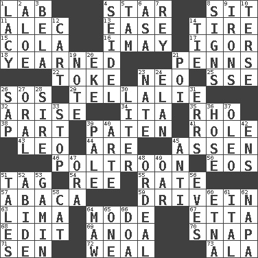 ACROSS 1. Experiment locale 4. Play the lead 8. Be seated 11. Actor Baldwin 13. Comfort 14. Hoop that covers a wheel 15. Root beer relative 16. "If ____ say so..." 17. Composer Stravinsky 18. Felt deep pity or tenderness 21. Actor Sean's family 22. Casino tip 23. Modern: prefix 25. Compass dir. 26. Distress signal 29. Copy Pinocchio 32. Originate 34. Call ___ day 35. 17th letter of the Greek alphabet 38. Component 39. Eucharist need 41. Hero or heavy, e.g. 43. Lion 44. "We ___ not amused" (Victoria) 45. NE Netherlands city 46. Coward 50. Greek goddess of the dawn 51. Label 54. To riddle 55. Pace 57. Phillipine bananalike plant 59. Popular '50s hangout 63. Pale green bean 64. Method 67. Singer James 68. Prepare for publication 69. Small Philippine buffalo 70. Fastener 71. Elected rep. 72. Welt 73. In the manner of DOWN 1. Made of lace 2. Medicinal plant 3. Actor Lugosi 4. A glass for beer 5. Scottish cap 6. White ___ sheet 7. Marina Del _, California 8. Public displays of written messages 9. Removes the wrinkles 10. Laconic 12. Draw slowly or heavily 14. Neckwear 19. Make mention of 20. Make supply last 21. Luau course 23. Nathan's nickname 24. Enthusiasm 26. Plant excrement 27. Relating to the mouth 28. Male parent of an animal 30. 61 cubic inches 31. Blunders 33. Halt 36. Stockings 37. Butter sub 39. Diluted with white 40. Johnson of "Laugh-In" 42. Followers of ems 45. Against 47. Mouth or opening 48. Severe or trying experience 49. Rowing implement 51. Falsehoods 52. Stay 53. Street urchin 56. Nights before holidays 58. Feline 60. Inactive volcano in Sicily 61. Slanted text style (abbr.) 62. California wine valley 64. Opening into something insatiable 65. Single 66. ___ good deed