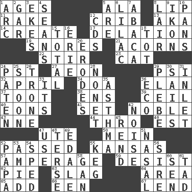 ACROSS 1. Matures 5. According to 8. Mouth edge 11. Libertine 12. Baby bed with high sides 13. Alias (abbr.) 14. Cause to be 17. Accusation by an informer 19. Sounds asleep 21. Oak nuts 22. Use a swizzle stick 23. Feline 24. Pacific Standard Time (abbr.) 27. A really long time 29. Air pressure measure (abbr.) 32. Showery time 34. ___ good deed 36. Enthusiasm 37. A blast of a horn 38. Followers of ems 39. To provide with a ceiling 40. Immeasurably long periods of time 41. Put into a specified state 42. Impressive in appearance 43. Compass dir. 44. Through, poetically 46. Eastern Standard Time (abbr.) 47. Shoshoni 50. Chow _ 52. Went by 55. Sunflower state 57. Electrical Measurement 59. Cease 62. Sliced dessert 63. Volcanic refuse 64. Type of rug 65. Say or write further 66. Car or cant ending 67. Grant temporary use of DOWN 1. Curve 2. Slender fish 3. Supplements with great effort 4. Actors Connery and Penn 5. "We ___ not amused" (Victoria) 6. Pale purple color 7. Phillipine bananalike plant 8. Den 9. Visual representation of an object 10. Zero-star reviews 12. Music discs 15. Add up to 16. 4th largest of the Great Lakes 18. Small child 20. Eats (away) 24. Eucharist need 25. Soup utensil 26. Marketplace scale 28. Music written for nine 29. First-year military academy student 30. Moves on water 31. An arm off of a larger body of water 33. ___ a Wonderful Life 35. Respiratory problem 36. Environmental prefix 42. Annoying sound 45. Tear apart 47. Purpose 48. Laconic 49. Peak District village in England 51. Rhinal 52. Dad 53. Among 54. Moved rapidly 55. Barrel 56. Beget 58. Separate the seeds from cotton 60. Elected rep. 61. Small amount or degree