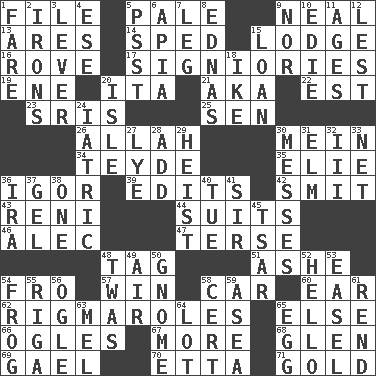 ACROSS 1. Do some clerical work 5. Diluted with white 9. Be tempered by heat 13. Ancient Greek god of war 14. Broke a traffic law 15. Cabin 16. Be footloose 17. Seigniories (variant) 19. Compass dir. 20. Call ___ day 21. Alias (abbr.) 22. Eastern Standard Time (abbr.) 23. Indian titles of respect 25. Elected rep. 26. Assad's deity 30. Chow _ 34. Miss Universe 1986, Barbara Palacios _ 35. Writer Wiesel 36. Russian composer Stravinsky 39. Prepares for publication 42. Stricken, poetically 43. Painter Guido (1575-1642) 44. Sets of matching outer garments 46. Actor Baldwin 47. Laconic 48. Label 51. American tennis player Robert 54. Back 57. Acquire through effort 58. 4-wheeled motor vehicle 60. Ewer handle 62. Frustrating wastes of time 65. Otherwise 66. Stares 67. Greater amount 68. Small, secluded valley 69. Highlander 70. Singer James 71. Gilded DOWN 1. Conductor's collection 2. Removes the wrinkles 3. Prying instrument 4. Compass dir. 5. Inconspicuous attention getter 6. Capital of Western Samoa 7. Part of a journey 8. Ferber et al. 9. And not 10. Singer Brickell 11. Ripens 12. For fear that 15. Grant temporary use of 18. D.D.E's nickname 20. Small island 24. Of or pertaining to medicine 27. Potassium hydroxide 28. Increase 29. Robbery 30. Makes clutter 31. Shade tree 32. One more than two 33. Remaining after all deductions 36. Lyricist Gershwin 37. Set 38. Single 40. Third day of the wk. 41. Title for a knight 45. Russian ruler of old 48. It was, poetically 49. Wind 50. Dwarf 52. Phone greeting 53. Artist's stand 54. Toadlike animal 55. Port city in Latvia 56. Stare at amorously 58. Certainty 59. Toward the sea 61. Tear apart 63. Cartoonist voice _ Blanc 64. Car dealer's back yard 65. Ovum