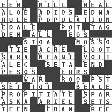 ACROSS 1. Car or cant ending 4. Place where flour is made 8. Be tempered by heat 12. _ vera 14. Goodbye (Sp.) 16. Pulitzer Prize-winning author Ferber 17. Court order 18. Census information 20. Peak District village in England 22. Plant holder 23. Label 24. Lair 25. Everything 28. Greek goddess of the dawn 30. Portico 31. With motion or animation 35. Make a knot 37. Land measure 40. Spoils 41. "Two Mules for Sister ____" 42. Intended 44. Electrical Unit 45. Actor Baldwin 46. Bristle 47. Conclusion 48. Mexican monetary units 50. Blunders 52. Armed conflict 54. Friend of Pooh 55. Pacific Standard Time (abbr.) 58. Arrange properly for use 61. Small child 63. Memphis, Tenn. Street 65. Conciliate 70. Practice fight 71. "____ silly question..." 72. Satellite of Uranus 73. Arranges properly for use 74. Adolescent 75. Dutch treat 76. To sift DOWN 1. Having ears or earlike features 2. Dodge 3. Pitcher Ryan 4. Atlas unit 5. Wedding promise 6. Mouth edge 7. Central Nebraska county 8. Fish or hair follower 9. Prepare for publication 10. Small Philippine buffalo 11. Long (Scottish) 13. Snakelike fish 15. _ gin 19. Smallest unit of an element 21. Erode 26. Rich soil 27. Shoestrings 29. Finds the solution 30. Manatee 32. Within a short period 33. Disposed of to a purchaser 34. Baseball player Mel 35. Story 36. Angers 38. Actress Charlotte 39. Keyboard key 41. Plant excrement 43. Edible starchy tuberous root 49. Suttee (variant) 51. Director Reiner 53. Round or rotation of duties 55. Some stationery 56. Chalkboard 57. Laconic 58. Argument over a trivial matter 59. Celtic language 60. Casino tip 62. Hoop that covers a wheel 64. Curvy letter 66. Baking dish 67. Assist 68. Afternoon social gathering 69. Shade tree