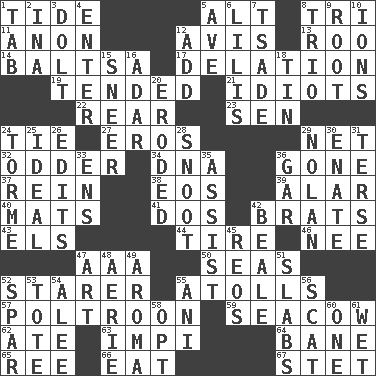 ACROSS 1. Periodic rise and fall of the sea level 5. Keyboard modifier key 8. Three (prefix) 11. At once, immediately (arch.) 12. Advice 13. Friend of Pooh 14. Greek mezzo-soprano Agnes 17. Accusation by an informer 19. Watched over 21. Foolish or stupid persons 22. Hitchcock's "____ Window" 23. Elected rep. 24. Make a knot 27. Greek god of love 29. Remaining after all deductions 32. More peculiar 34. Heredity factor (abbr.) 36. Went 37. It's straight from the horse's mouth 38. Greek goddess of the dawn 39. Having or resembling wings 40. Floor protectors 41. Two (Sp.) 42. Naughty children 43. Raised railways 44. Hoop that covers a wheel 46. Born 47. Auto club (abbr.) 50. Oceans 52. A viewer who gazes fixedly 55. Ringlike coral islands and reefs 57. Characterized by complete cowardliness 59. Manatee 62. Had dinner 63. Body of Kaffir warriors 64. Object of repulsion 65. To riddle 66. Erode 67. Proofreading order DOWN 1. Keyboard key 2. _ tizzy (2 wds.) 3. Dunce 4. Keyboard key 5. "___ Maria" 6. Ms. Damita and namesakes 7. Sadhe (variant) 8. Musical group of three 9. Carrot, for example 10. Charged particles 12. Increase 15. Scornful expression 16. The sixth month of the Jewish calendar 18. Shallow baking pan 20. Eaten away 24. Singer Mel 25. Standard of perfection 26. Proofreads 28. Snout, nose 29. Pitcher Ryan 30. Maternal 31. Laconic 33. Followers of ems 35. Help 36. Slender fish 42. Calif. Air Force Base 45. Vintage cars 47. Tate display 48. Nest on high 49. Scent 51. Broad, flat, thick pieces 52. Coast Guard woman 53. Carryall 54. Toward shelter 55. Cuckoo 56. Leave at once 58. Elect 60. Single 61. Soggy