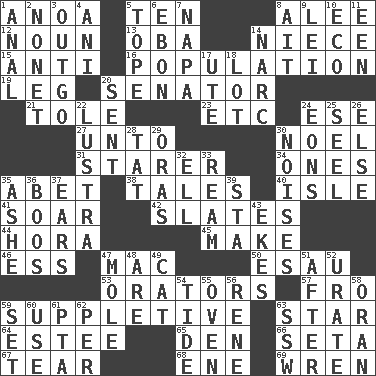 ACROSS 1. Small Philippine buffalo 5. "___ Little Indians" 8. Toward shelter 12. Part of speech 13. Chief or king in Benin or Nigeria 14. Sibling's daughter 15. Opposed to 16. Census information 19. Part of a journey 20. Elected representative 21. Lacquered or enameled metalware 23. And so on (abbr.) 24. Compass dir. 27. To (old English) 30. Christmas carol 31. A viewer who gazes fixedly 34. Washington bills 35. Collude with 38. Lies 40. Capri or Wight 41. Fly high 42. Chalkboards 44. Israeli folk dance 45. Cause to be 46. Curvy letter 47. Big _ 50. Son of Isaac 53. Speakers 57. Away 59. Supplying deficiencies 63. Play the lead 64. First name in cosmetics 65. Lair 66. Bristle 67. Rend 68. Compass dir. 69. Songbird DOWN 1. Of or related to the anus 2. Music written for nine 3. Outlay 4. Black tropical American cuckoo 5. Drink excessively 6. Inky black, to poets 7. California wine valley 8. Small island 9. Flowery wreath 10. Environmental prefix 11. Car or cant ending 14. Drug cop 17. Shoshoni 18. Car dealer's back yard 20. Emitted 22. A period of five years 24. Immeasurably long periods of time 25. Stitch closed the eyes of (a falcon) 26. Otherwise 28. Make lace 29. Mouths or openings 30. Annoying sounds 32. Pipe bend 33. 480, 500 or 516 sheets of paper 35. American tennis player Robert 36. Scornful sounds 37. Hearing organs 39. R.R. building 43. Makes supply last 47. Undercover agent 48. "We ___ not amused" (Victoria) 49. Feline 51. Following 52. A salt of uric acid 54. Event that recurs at intervals 55. Baking chamber 56. French philosopher Descartes 58. NW Algerian seaport 59. Arrange properly for use 60. Purpose 61. Parent Teacher Assoc. 62. For each 63. Compass dir.