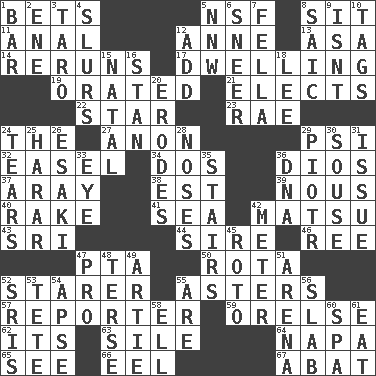 ACROSS 1. Stakes 5. Overdraft (abbr.) 8. Be seated 11. Of or related to the anus 12. Singer Murray 13. White ___ sheet 14. Summer TV shows 17. Residence 19. Spoke pompously 21. Opts 22. Play the lead 23. Actress Charlotte 24. Definite Article 27. Soon (poet.) 29. Air pressure measure (abbr.) 32. Artist's stand 34. Two (Sp.) 36. "Vaya con ____" 37. Like ___ of sunshine 38. Eastern Standard Time (abbr.) 39. Horse sense 40. Immoral or dissolute person 41. Ocean 42. Taiwanese island in East China Sea 43. _ Lanka 44. The founder of a family 46. Portuguese money of account (variant) 47. Parent Teacher Assoc. 50. Round or rotation of duties 52. A viewer who gazes fixedly 55. Michaelmas daisies 57. News announcer 59. Threatening words 62. It is 63. Drop; flow; fall 64. California wine valley 65. Observe 66. Snakelike fish 67. Blind as ____ DOWN 1. Long, evenly shaped piece 2. Compass dir. 3. Pacific island yam 4. Plays smoothly or legato 5. Compass dir. 6. Scornful expression 7. Man or boy (slang) 8. Ketch in the Levant 9. Is not 10. Labels 12. Find the sum of 15. Brizilian seaport 16. Comedian Laurel of Laurel & Hardy 18. Area sheltered from the wind 20. Eats (away) 24. Rends 25. Ethiopian city, capital of Harari 26. 1973 Nobel Price Winner (Physics) Leo 28. Olfactory organs 29. Peter (Polish) 30. Boozer 31. Come out of 33. Sight organ 35. Flight of steps 36. Heredity factor (abbr.) 42. Distance measurement 45. Printing process, for short 47. Adept person 48. Laconic 49. Nick name for Arthur 51. Sports stadium 52. Indian titles of respect 53. False hair 54. Domed church section 55. "We ___ not amused" (Victoria) 56. Thick slice 58. Pipe bend 60. Health resort 61. Consume