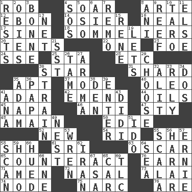 ACROSS 1. Director Reiner 4. Fly high 8. Johnson of "Laugh-In" 12. Inky black, to poets 14. Flexible twig of a willow tree 16. Be tempered by heat 17. Trig term 18. Wine waiters 20. Portable shelters 22. Single 23. Enemy 24. Compass dir. 25. R.R. building 28. And so on (abbr.) 30. Play the lead 31. Pottery fragment 35. Fitting 37. Method 40. Butter sub 41. The sixth month of the Jewish calendar 42. Make improvements or corrections to 44. Lubricates 45. California wine valley 46. Opposed to 47. Filthy place 48. With great haste 50. Singer Brickell 52. ___ Haven, CT 54. To free from 55. A female animal or person 58. Quiet! 61. Indian title of respect (Mr.) 63. Motion picture award 65. Act in opposition 70. Merit 71. So be it 72. Relating to the nose 73. Jai ____ 74. Connecting point 75. Drug cop 76. "We ___ not amused" (Victoria) DOWN 1. Musical pauses 2. Off-Broadway awards 3. Child's nurse 4. Distress signal 5. Bear (Spanish) 6. Direct toward a target or goal 7. San ____ (Riviera town) 8. Cuckoo 9. Coral collection 10. Pacific island yam 11. Otherwise 13. Fish or hair follower 15. French philosopher Descartes 19. Allows 21. Fast jet (abbr.) 26. Docile 27. Odor 29. Opt 30. Put through a sieve 32. Came down and settled, as after flight 33. Have trust in 34. Two (Sp.) 35. First of billions? 36. Dad 38. Lair 39. Keyboard key 41. Santa ___, CA 43. "You Light Up My Life" star Conn 49. A home for chicks 51. Wedding promise 53. Songbird 55. Any of the three canals of the cochlea 56. Ethiopian city, capital of Harari 57. Bert's buddy 58. Examine minutely or intensely 59. Same (prefix) 60. Became colored 62. SW Asia republic 64. Ocean 66. Compass dir. 67. White ___ sheet 68. Automobile 69. Affectionate concern, for short
