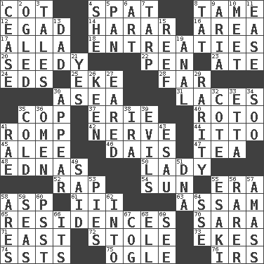 ACROSS 1. Small bed 4. Argument over a trivial matter 8. Docile 12. Mild oath 14. Ethiopian city, capital of Harari 16. Length times width 17. Silent film actress Nazimova 18. Pleas 20. Morally degraded 22. Animal enclosure 23. Had dinner 24. Begley and Asner 25. Supplement with great effort 28. Distant 30. At sea 31. Shoestrings 35. Police officer (slang) 37. One of the Great Lakes 40. Printing process, for short 41. Frolic 42. Effrontery 44. "Tell ____ the Marines!" 45. Toward shelter 46. Raised platform 47. Afternoon social gathering 48. Ferber et al. 50. Kenny Rogers chart-topper in '80 52. Strike 54. Player for Phoenix 55. Period 58. Cleo's killer 61. One more than two 63. Indian state 65. Homes 70. "Two Mules for Sister ____" 71. 90 degrees 72. Took without asking 73. Makes supply last 74. Fast planes 75. Stare at amorously 76. Big collection agency DOWN 1. Stop 2. Stared at amorously 3. Falsehoods 4. A female animal or person 5. Baking dish 6. Nonscientific branch of learning 7. Canvas cover 8. Make lace 9. Operatic vocal solo 10. Rendezvous 11. Comfort 13. June honoree 15. Coral ridge 19. Of or related to the anus 21. Consenting reply 26. Peachy ____! 27. Having ears or earlike features 29. Noteworthy scarcity 30. Become visible 32. ____ d'Azur (French Riviera) 33. Singer James 34. "Barney Miller" actor Jack 35. Chilled 36. Sign of something about to happen 38. Retirement account (abbr.) 39. Vices 41. Actress Charlotte 43. Son of Isaac 49. Stated 51. Heredity factor (abbr.) 53. Sliced desserts 55. 1973 Nobel Price Winner (Physics) Leo 56. More valued for its uncommonness 57. Collect or gather 58. Ancient Greek god of war 59. Oceans 60. Inconspicuous attention getter 62. To the inside or interior of 64. Compass dir. 66. It is 67. Gear tooth 68. Pipe bend 69. Perceive with the eye