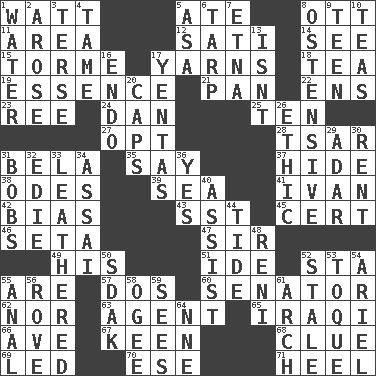 ACROSS 1. Electrical Unit 5. Had dinner 8. Baseball player Mel 11. Length times width 12. Suttee (variant) 14. Perceive with the eye 15. Singer Mel 17. Tall tales 18. Afternoon social gathering 19. Core 21. Baking dish 22. Followers of ems 23. Portuguese money of account (variant) 24. One of the 12 tribes of Israel 25. "___ Little Indians" 27. Elect 28. Russian ruler of old 31. Actor Lugosi 35. Declare 37. Flintstone garb 38. Lyric poems 39. Ocean 41. _ the terrible 42. Prejudice 43. Fast jet (abbr.) 45. An absolute certainty 46. Bristle 47. Title for a knight 49. Part of HMS, perhaps 51. Binary compound 52. R.R. building 55. "We ___ not amused" (Victoria) 57. Two (Sp.) 60. Elected representative 62. Not either 63. Representative 65. Resident of Iraq 66. "___ Maria" 67. Peachy ____! 68. A slight indication 69. Directed 70. Compass dir. 71. Person who is morally reprehensible DOWN 1. Wetness 2. Came up 3. Laconic 4. Not wild 5. White ___ sheet 6. Canvas cover 7. Inactive volcano in Sicily 8. Clearly or manifestly demonstrative 9. Adolescent 10. Afternoon social gatherings 13. Is not 16. Inside; within (prefix) 17. Gossips 20. Smile enhancers 26. Principle of right and wrong 29. The sixth month of the Jewish calendar 30. Monthly bill 31. Moves up and down 32. Singer Brickell 33. Tough but pliablecoriaceous 34. Slender Brazilian palm 36. Consenting reply 40. Help 44. Periodic rise and fall of the sea level 48. Painter Guido (1575-1642) 50. Neighbor of Neb. 52. Showing deterioration from age 53. Woman's close-fitting hat 54. Satellite of Uranus 55. Of or related to the anus 56. Be footloose 58. Double curve, resembling the letter S 59. Perceives with the eye 61. Bowlike part 64. Compass dir.