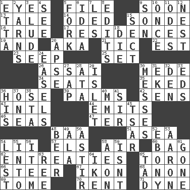 ACROSS 1. Sight organs 5. Do some clerical work 9. Within a short period 13. Falsehood 14. Wrote a lyric poem 15. Something which is sent 16. Loyal 17. Homes 19. Also 20. Alias (abbr.) 21. Nervous spasm 22. Eastern Standard Time (abbr.) 23. Ooze 25. Arrange properly for use 26. Slender Brazilian palm 30. Ancient Persian 34. Theater features 35. Supplemented with great effort 36. Stockings 39. Insides of hands 42. Elected reps. 43. International (abbr.) 44. Gives off 46. Oceans 47. Laconic 48. Sound made by sheep 51. At sea 54. Cards in a Roman deck? 57. Raised railways 58. Wind 60. Container for groceries 62. Pleas 65. "Corrida" creature 66. Navigate 67. Picture 68. Soon (poet.) 69. Heavy book 70. Monthly bill 71. Centimeter-gram-second unit of force DOWN 1. Singer James 2. Tall tales 3. Dodge 4. Perceive with the eye 5. Tined utensil 6. It may be bright or harebrained 7. French article 8. Prepares for publication 9. Male offspring 10. Single time 11. Lyric poems 12. Egg locale 15. Religious group 18. Expire 20. Domed church section 24. Artist's stands 27. Plant excrement 28. _ moment's notice (2 wds.) 29. Small island 30. Makes clutter 31. Supplement with great effort 32. Lair 33. Begley and Asner 36. Part of HMS, perhaps 37. Single 38. R.R. building 40. Madame (abbr.) 41. Title for a knight 45. Russian ruler of old 48. Fermented drink made from hops 49. Insect wing 50. Moving or stirring 52. Black 53. Composer Copland 54. For fear that 55. To the inside or interior of 56. Detail 58. Period of immesurable duration 59. Is not 61. Went 63. To separate or throw off 64. Eisenhower's nickname 65. Bit