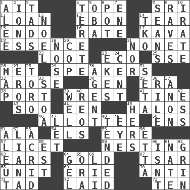 ACROSS 1. Small island 4. Drink excessively 8. _ Lanka 11. Grant temporary use of 13. Inky black, to poets 14. Lacerate 15. Inside; within (prefix) 16. Pace 17. Polynesian shrub of the pepper family 18. Core 21. Music written for nine 22. Plunder 23. Environmental prefix 25. Compass dir. 26. Was introduced to 29. Orators 32. Came up 34. Commissioned mil. rank 35. Period 38. Sweet dark-red dessert wine 39. Obtain by seizing forcibly or violently 41. Prong on a fork 43. "Barney Miller" actor Jack 44. Car or cant ending 45. Rings 46. One to whom something is allotted 50. Followers of ems 51. Chicken ___ king 54. Raised railways 55. Jane of fiction 57. It is permitted: Lat. 59. Inhabiting a nest 63. Hearing organs 64. Precious metal 67. Russian ruler of old 68. A single undivided whole 69. One of the Great Lakes 70. Against 71. Small boy 72. Put down 73. Nine, plus one DOWN 1. Toward shelter 2. Charged particles 3. Bits 4. Cylindrical with tapered ends 5. Chief or king in Benin or Nigeria 6. Cooking vessel 7. Compass dir. 8. Seines 9. All-night dance parties 10. Feeling or showing extreme anger 12. Christmas carol 14. Ring climax 19. Olfactory organ 20. Police officer (slang) 21. Not either 23. Supplements with great effort 24. Penny 26. Atlas unit 27. Greek god of love 28. "Corrida" creature 30. Rep 31. Bristle 33. Portico 36. Cause heat under the collar 37. At once, immediately (arch.) 39. Water source 40. Vintage cars 42. Curvy letter 45. Possessive pronoun 47. Allow 48. Watched over 49. Sight organ 51. Eskimo relative 52. Climbing, woody, usually tropical vines 53. Sour-tasting 56. Singer James 58. Eastern Standard Time (abbr.) 60. Is not 61. Nathan's nickname 62. Broad smile 64. Set 65. Mouth or opening 66. Cards in a Roman deck?